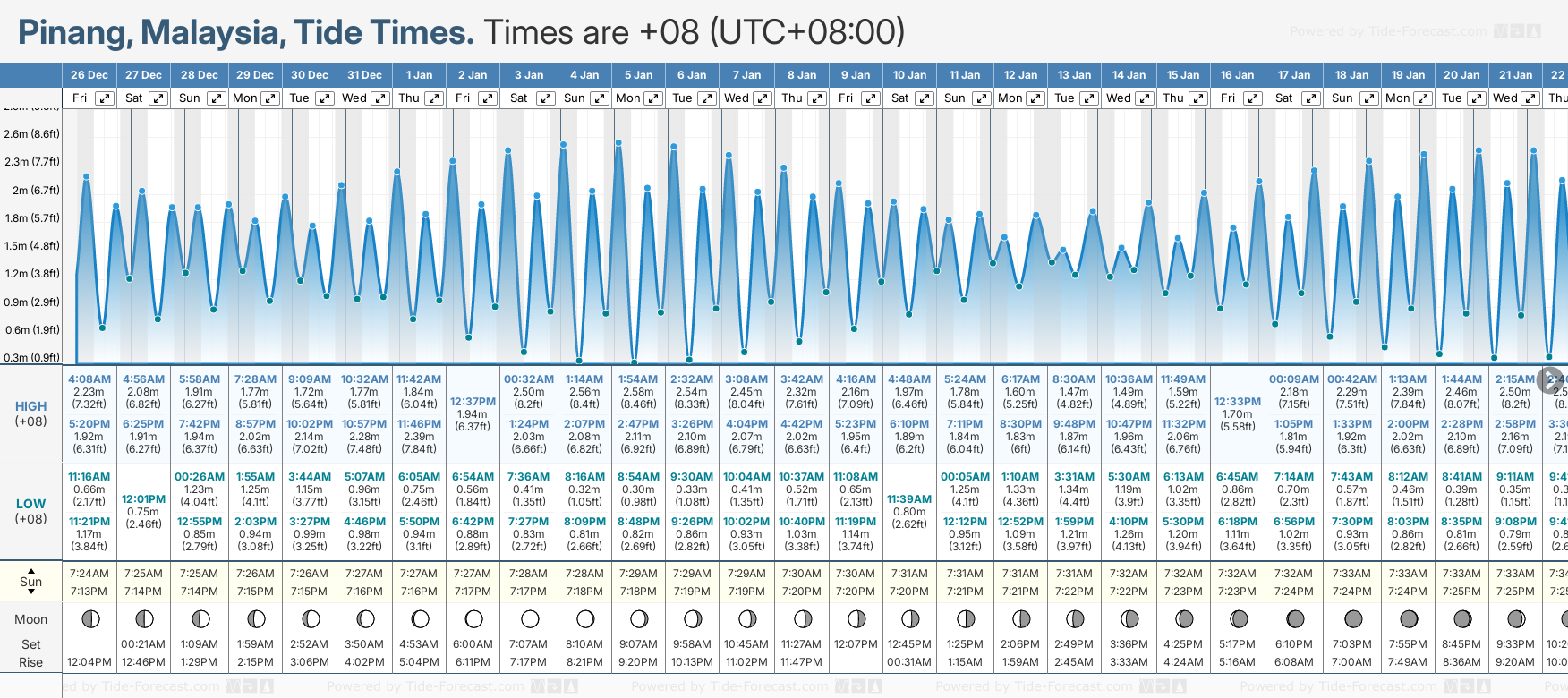 Tide Times are +08 (UTC +8.0hrs). Last Spring High Tide at Pinang was on Tue 23 Dec (height: 2.45m 8.0ft). Next high Spring Tide at Pinang will be on Mon 05 Jan (height: 2.58m 8.5ft).