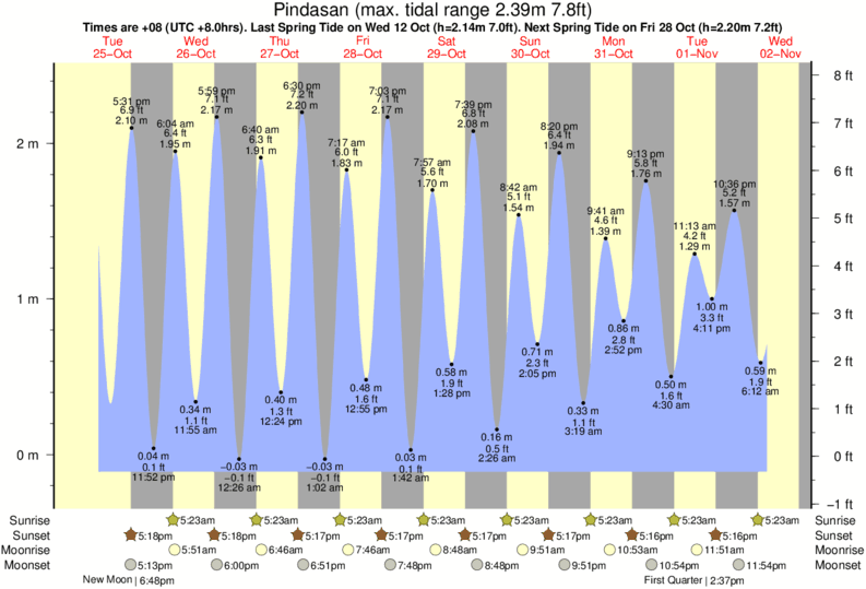 Tide Times are PST (UTC +8.0hrs). Last Spring High Tide at Pindasan was on Sun 07 Dec (height: 2.27m 7.4ft). Next high Spring Tide at Pindasan will be on Mon 22 Dec (height: 2.02m 6.6ft).