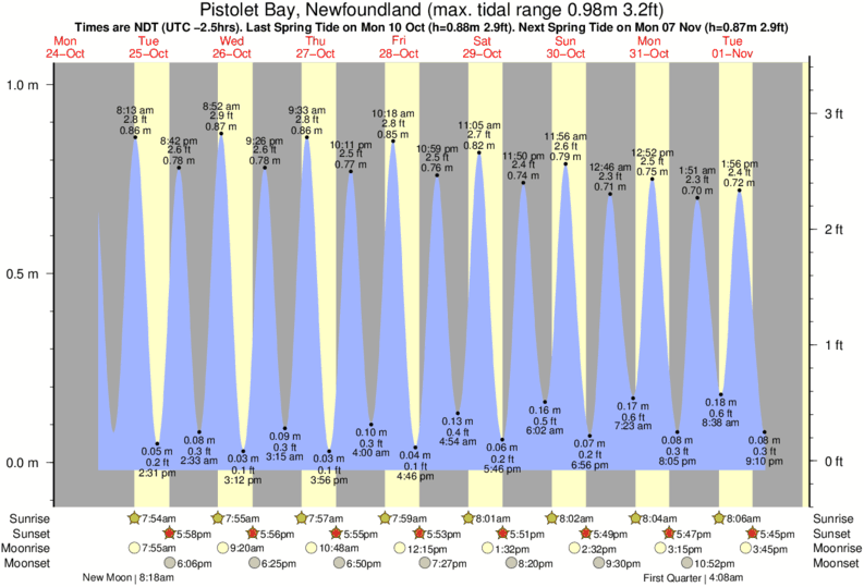 Tide chart for Pistolet BayShowing low and high tide times for the next 30 days at Pistolet Bay. Tide Times are NST (UTC -3.5hrs).