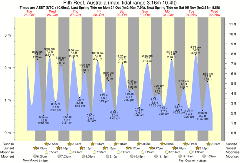 Tide Times are AEST (UTC +10.0hrs). Last Spring High Tide at Pith Reef was on Fri 19 Dec (height: 2.63m 8.6ft). Next high Spring Tide at Pith Reef will be on Fri 02 Jan (height: 3.15m 10.3ft).