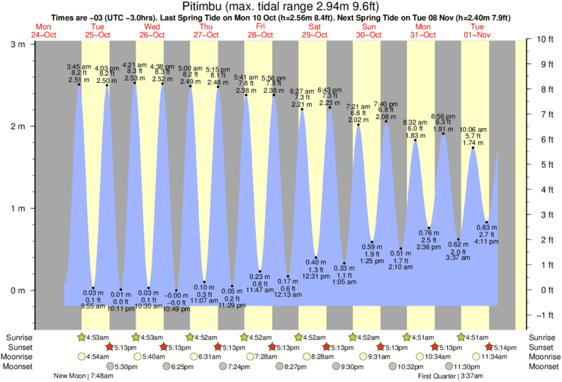 Tide Times are -03 (UTC -3.0hrs). Last Spring High Tide at Pitimbu was on Fri 05 Dec (height: 2.55m 8.4ft). Next high Spring Tide at Pitimbu will be on Mon 22 Dec (height: 2.26m 7.4ft).