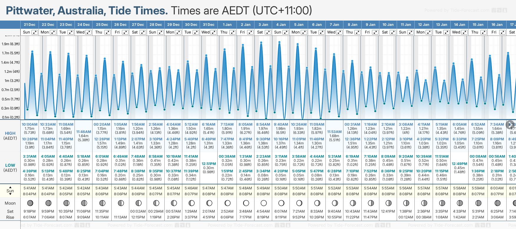 December and January Tide charts for Pittwater: The tide charts below show the height, time and date of high and low tides for the next 30 days.