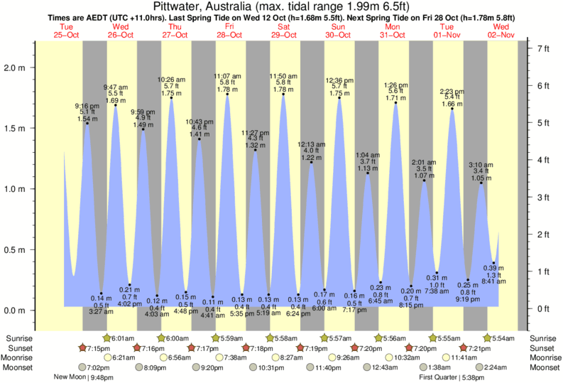 Tide Times are AEDT (UTC +11.0hrs). Last Spring High Tide at Pittwater was on Sun 21 Dec (height: 1.75m 5.7ft). Next high Spring Tide at Pittwater will be on Sun 04 Jan (height: 1.98m 6.5ft).