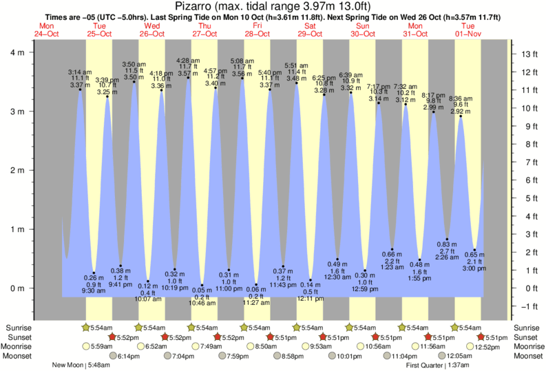 Tide Times are -05 (UTC -5.0hrs). Last Spring High Tide at Pizarro was on Fri 05 Dec (height: 3.65m 12.0ft). Next high Spring Tide at Pizarro will be on Sun 21 Dec (height: 3.10m 10.2ft).