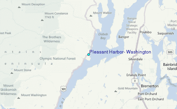 Use this relief map to navigate to tide stations, surf breaks and cities that are in the area of Pleasant Harbor, Washington.