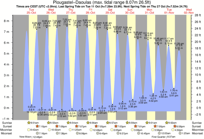 Tide Times are CET (UTC +1.0hrs). Last Spring High Tide at Plougastel-Daoulas was on Sat 06 Dec (height: 8.08m 26.5ft). Next high Spring Tide at Plougastel-Daoulas will be on Wed 24 Dec (height: 7.17m 23.5ft).