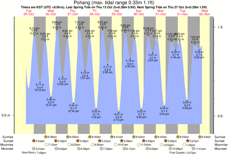 Tide Times are KST (UTC +9.0hrs). Last Spring High Tide at Pohang was on Mon 15 Dec (height: 0.23m 0.8ft). Next high Spring Tide at Pohang will be on Sun 21 Dec (height: 0.28m 0.9ft).