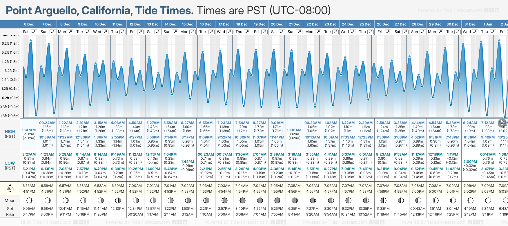 Tide Times are PST (UTC -8.0hrs). Last Spring High Tide at Point Arguello was on Fri 05 Dec (height: 2.08m 6.8ft). Next high Spring Tide at Point Arguello will be on Fri 19 Dec (height: 1.72m 5.6ft).