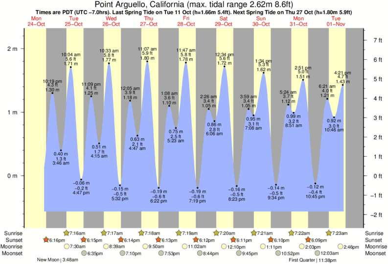 Tide Times are PST (UTC -8.0hrs). Last Spring High Tide at Point Arguello was on Fri 19 Dec (height: 1.72m 5.6ft). Next high Spring Tide at Point Arguello will be on Fri 02 Jan (height: 2.02m 6.6ft).