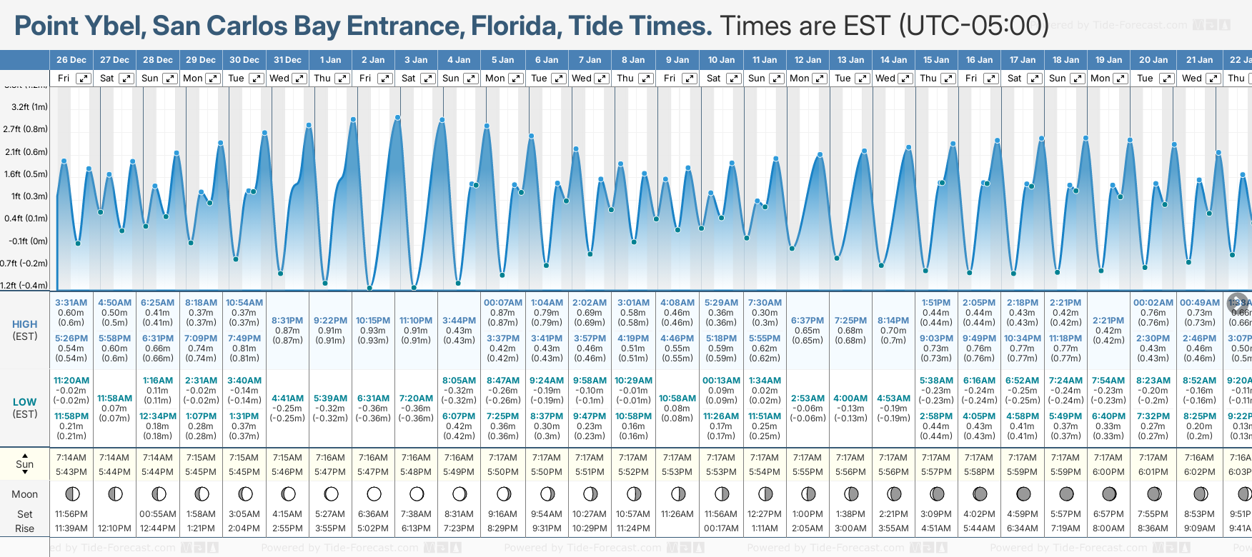 Point Ybel, San Carlos Bay Entrance tide times for December and January