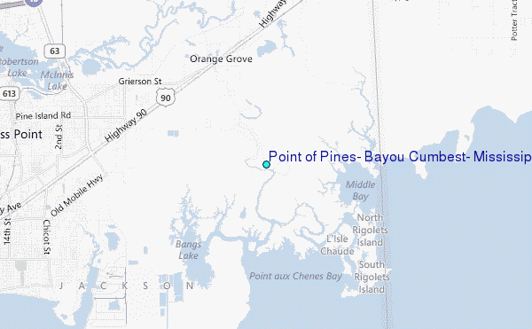 Use this relief map to navigate to tide stations, surf breaks and cities that are in the area of Point of Pines, Bayou Cumbest, Mississippi.