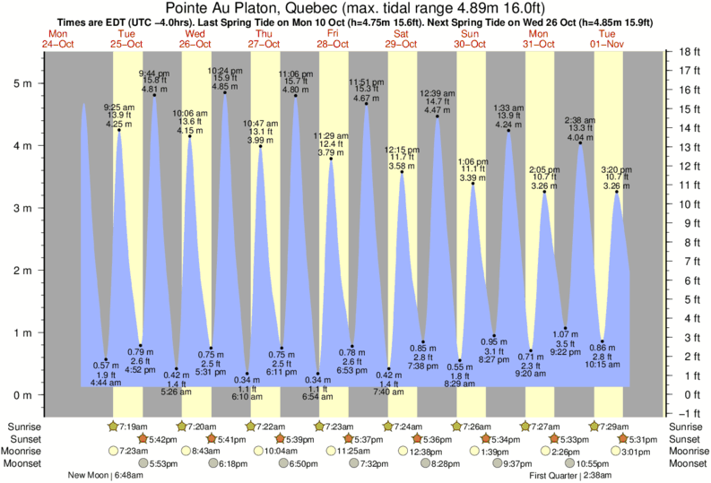 Tide Times are EST (UTC -5.0hrs). Last Spring High Tide at Pointe Au Platon was on Thu 04 Dec (height: 5.04m 16.5ft). Next high Spring Tide at Pointe Au Platon will be on Sun 21 Dec (height: 4.47m 14.7ft).