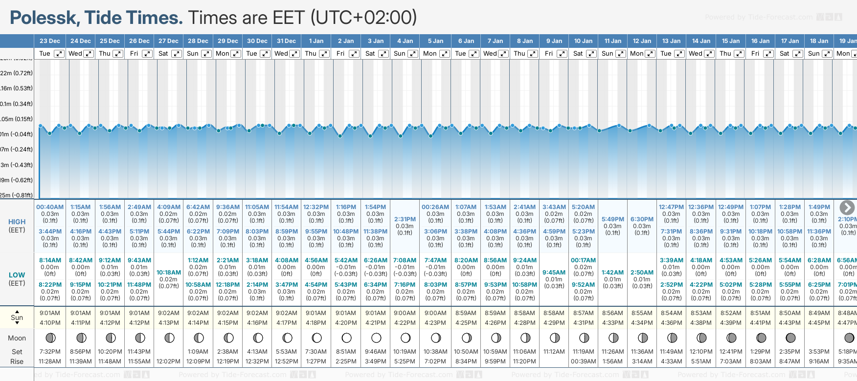 December and January Tide charts for Polessk: The tide charts below show the height, time and date of high and low tides for the next 30 days.