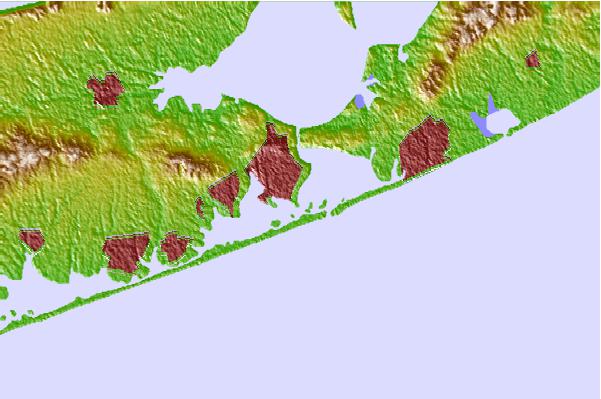 Use this relief map to navigate to tide stations, surf breaks and cities that are in the area of Ponquogue Bridge, New York.