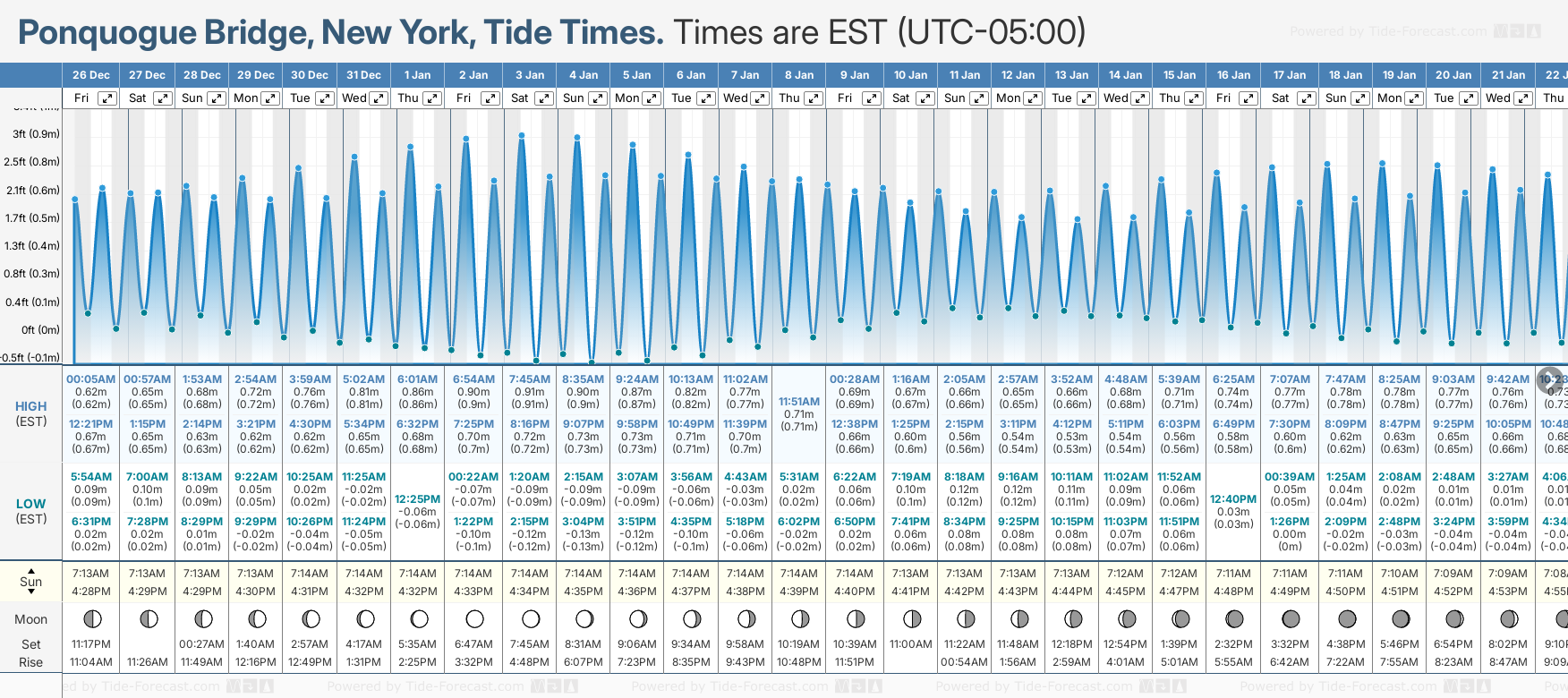 December and January Tide charts for Ponquogue Bridge: The tide charts below show the height, time and date of high and low tides for the next 30 days.