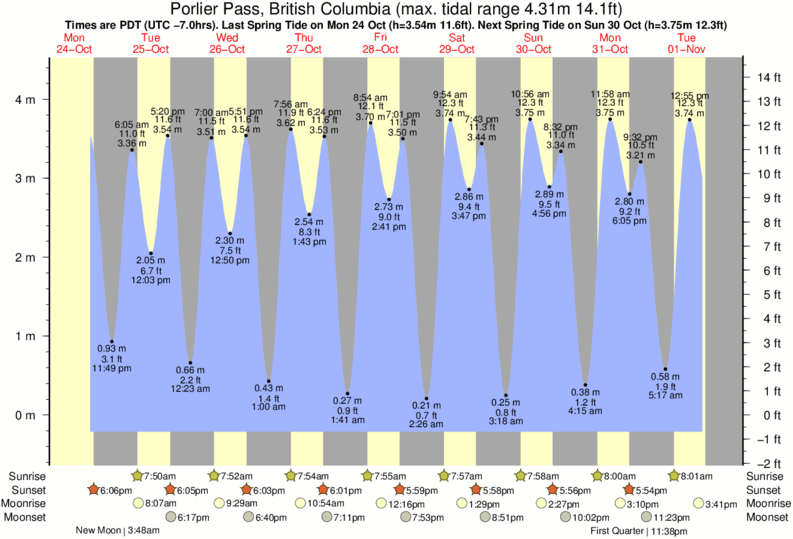 Tide Times are PST (UTC -8.0hrs). Last Spring High Tide at Porlier Pass was on Sun 07 Dec (height: 4.00m 13.1ft). Next high Spring Tide at Porlier Pass will be on Fri 26 Dec (height: 4.06m 13.3ft).