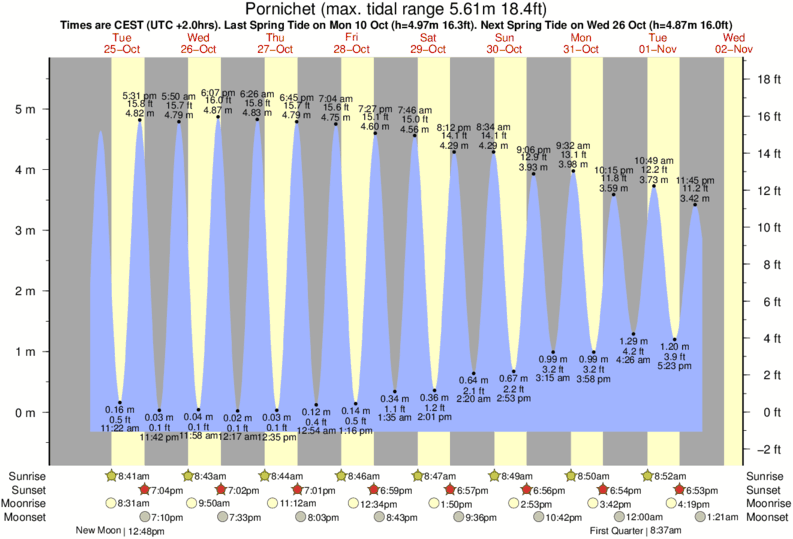 Tide chart for PornichetShowing low and high tide times for the next 30 days at Pornichet. Tide Times are CET (UTC +1.0hrs).