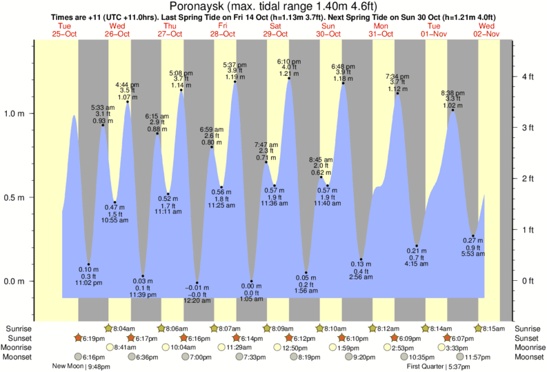 December and January Tide charts for Poronaysk: The tide charts below show the height, time and date of high and low tides for the next 30 days.