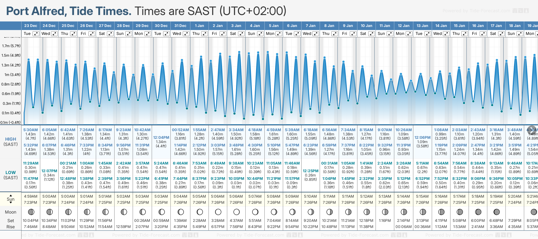 December and January Tide charts for Port Alfred: The tide charts below show the height, time and date of high and low tides for the next 30 days.