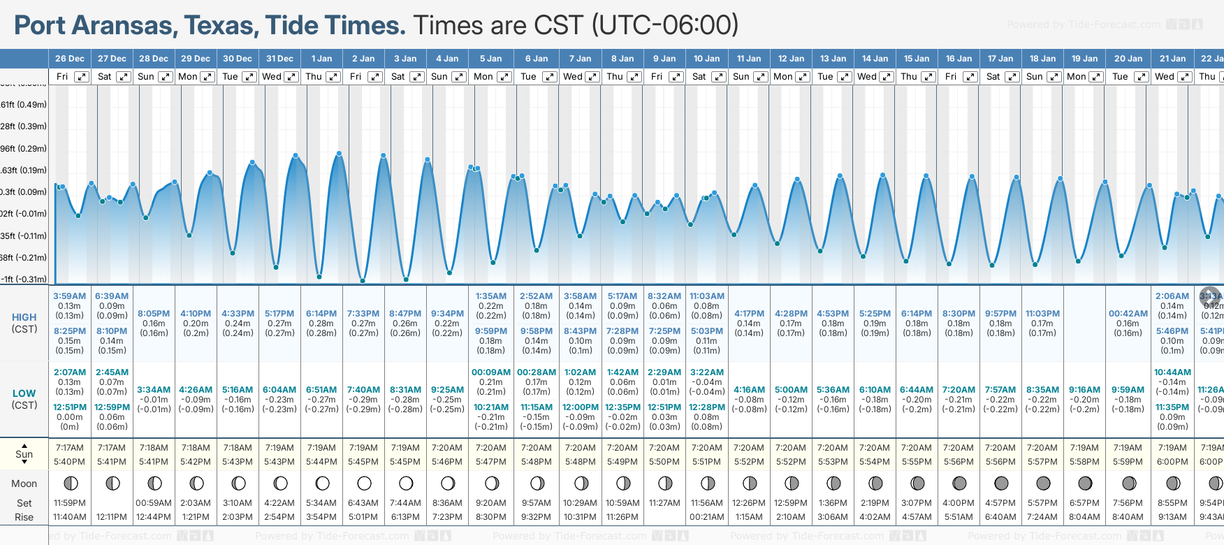 Tide chart for Port AransasShowing low and high tide times for the next 30 days at Port Aransas. Tide Times are CST (UTC -6.0hrs).