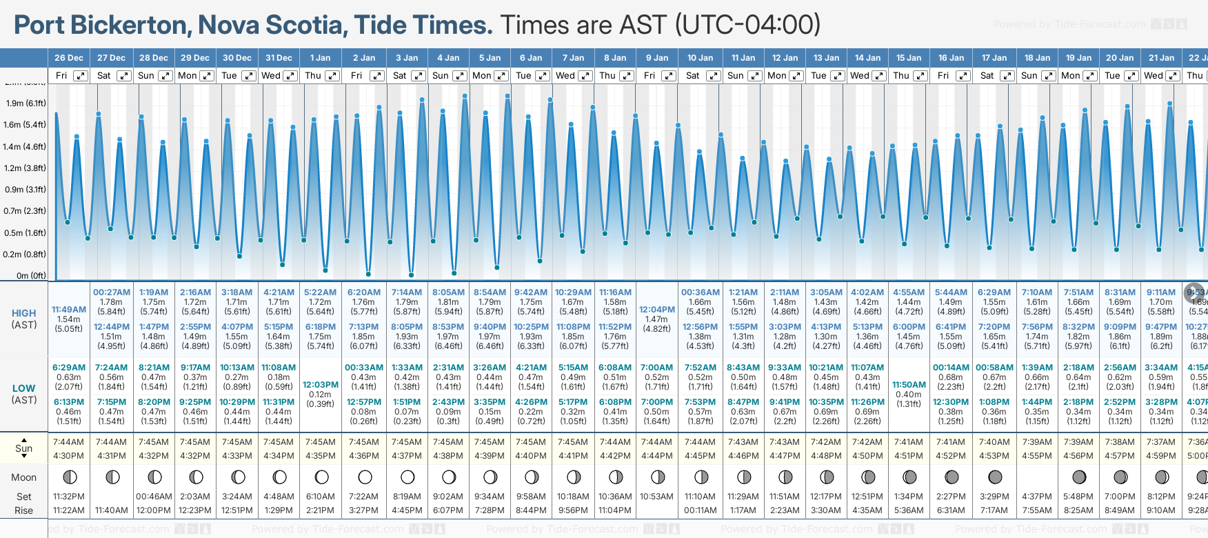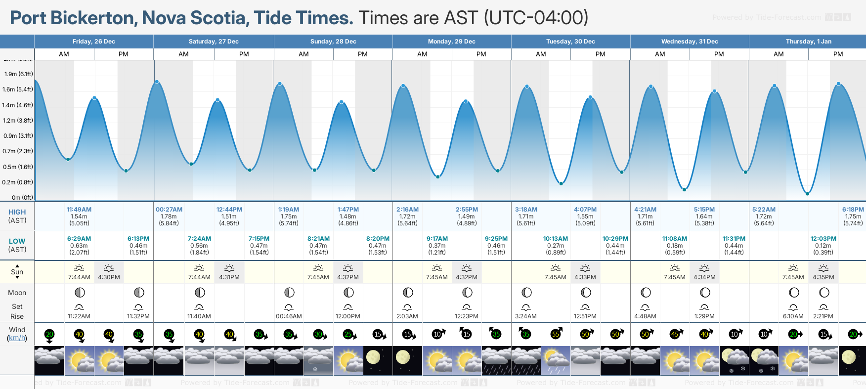 Tide Times are AST (UTC -4.0hrs). Last Spring High Tide at Port Bickerton was on Sat 06 Dec (height: 1.94m 6.4ft). Next high Spring Tide at Port Bickerton will be on Thu 25 Dec (height: 1.80m 5.9ft).