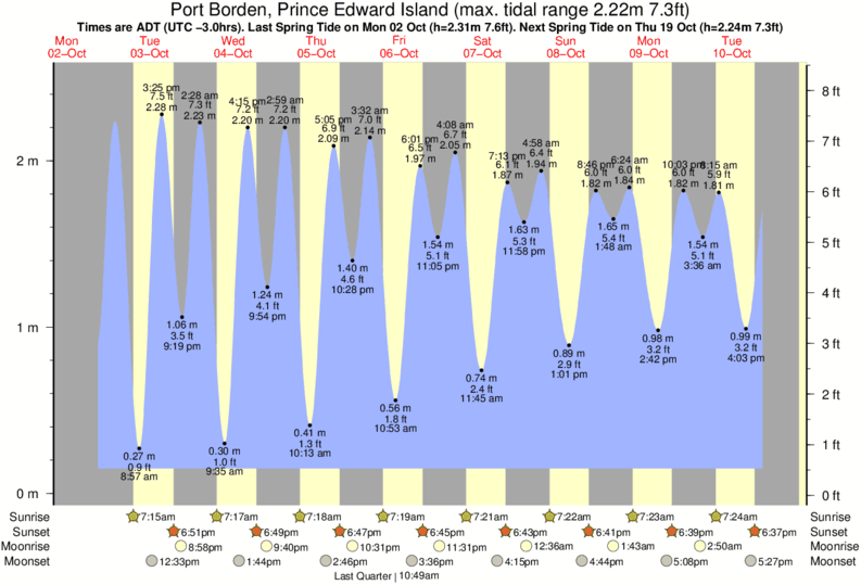 Tide chart for Port BordenShowing low and high tide times for the next 30 days at Port Borden. Tide Times are AST (UTC -4.0hrs).