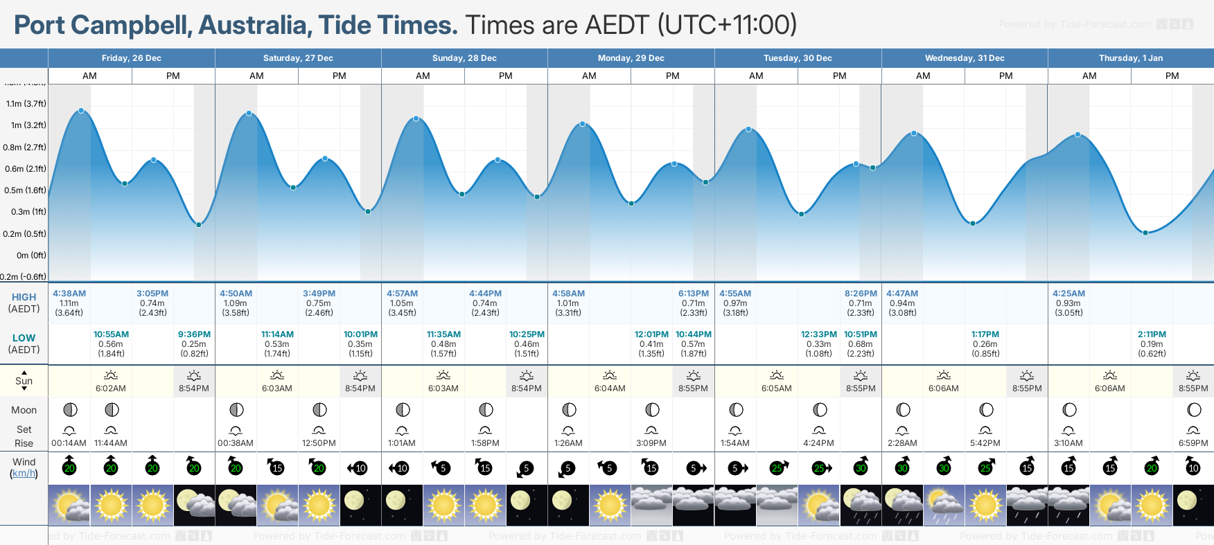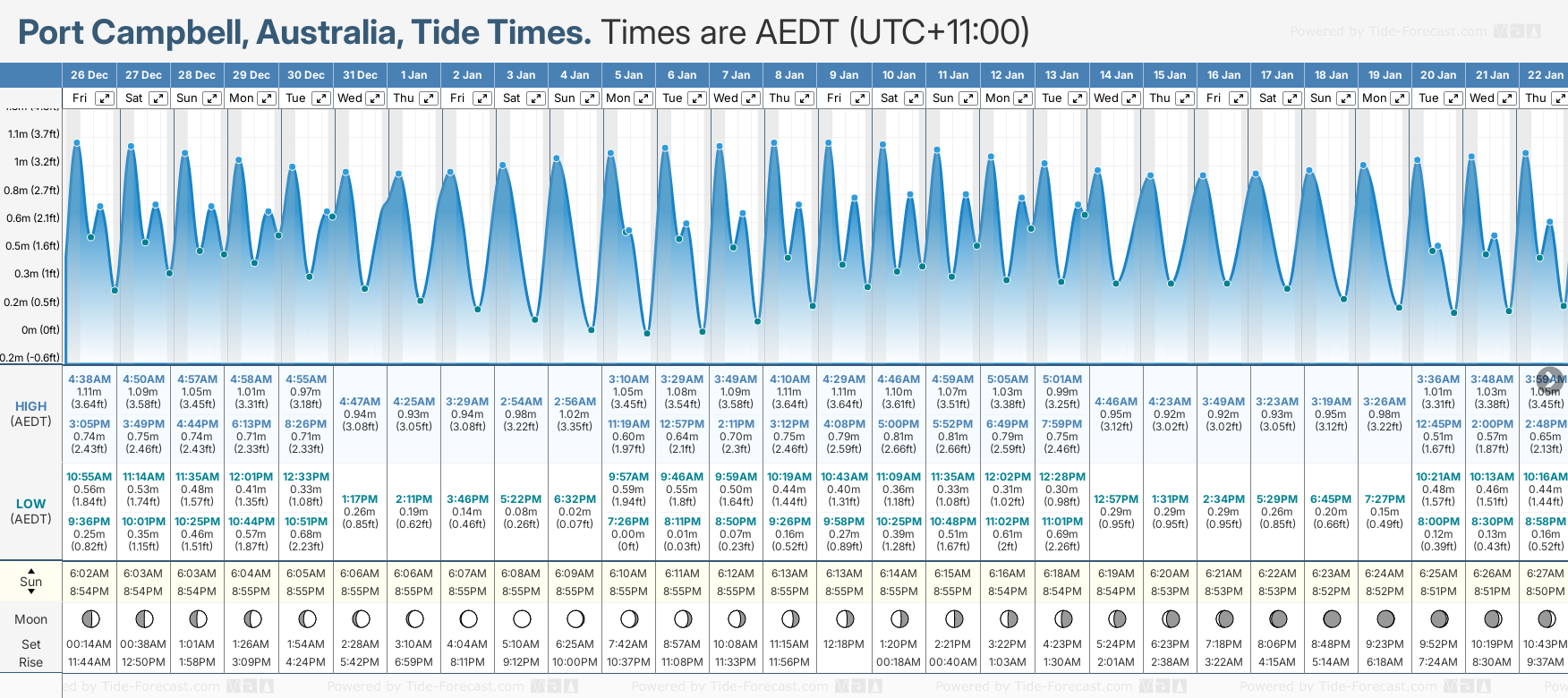 December and January Tide charts for Port Campbell: The tide charts below show the height, time and date of high and low tides for the next 30 days.
