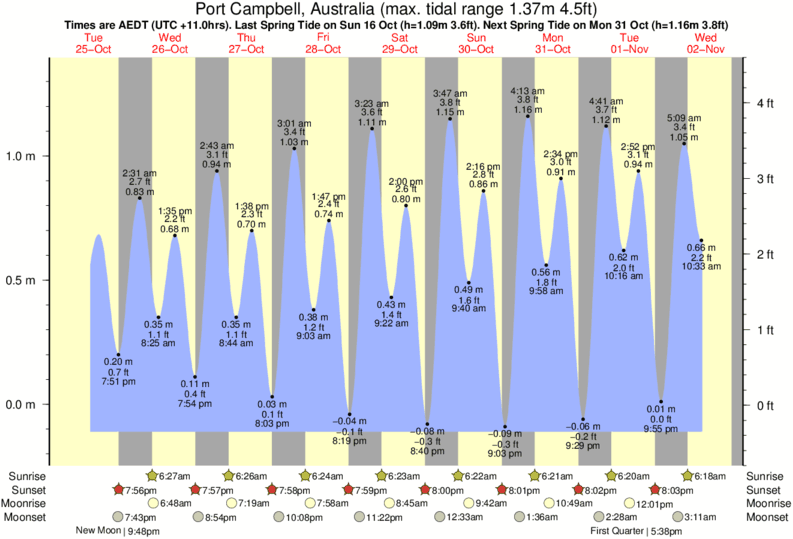 Tide chart for Port CampbellShowing low and high tide times for the next 30 days at Port Campbell. Tide Times are AEDT (UTC +11.0hrs).