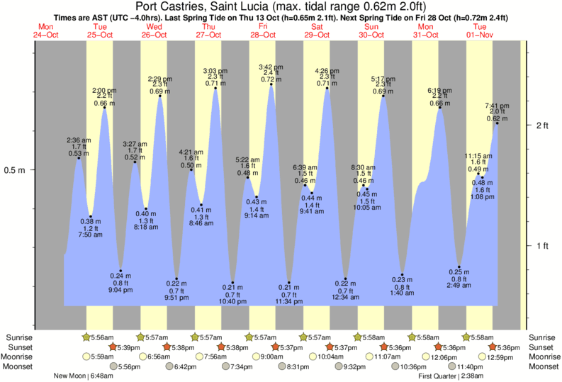 Tide Times are AST (UTC -4.0hrs). Last Spring High Tide at Port Castries was on Fri 05 Dec (height: 0.78m 2.6ft). Next high Spring Tide at Port Castries will be on Sat 20 Dec (height: 0.69m 2.3ft).
