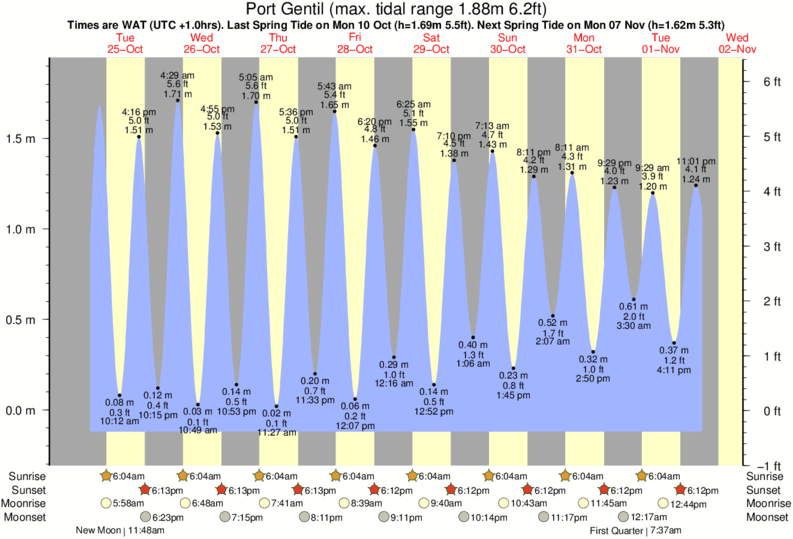December and January Tide charts for Port Gentil: The tide charts below show the height, time and date of high and low tides for the next 30 days.