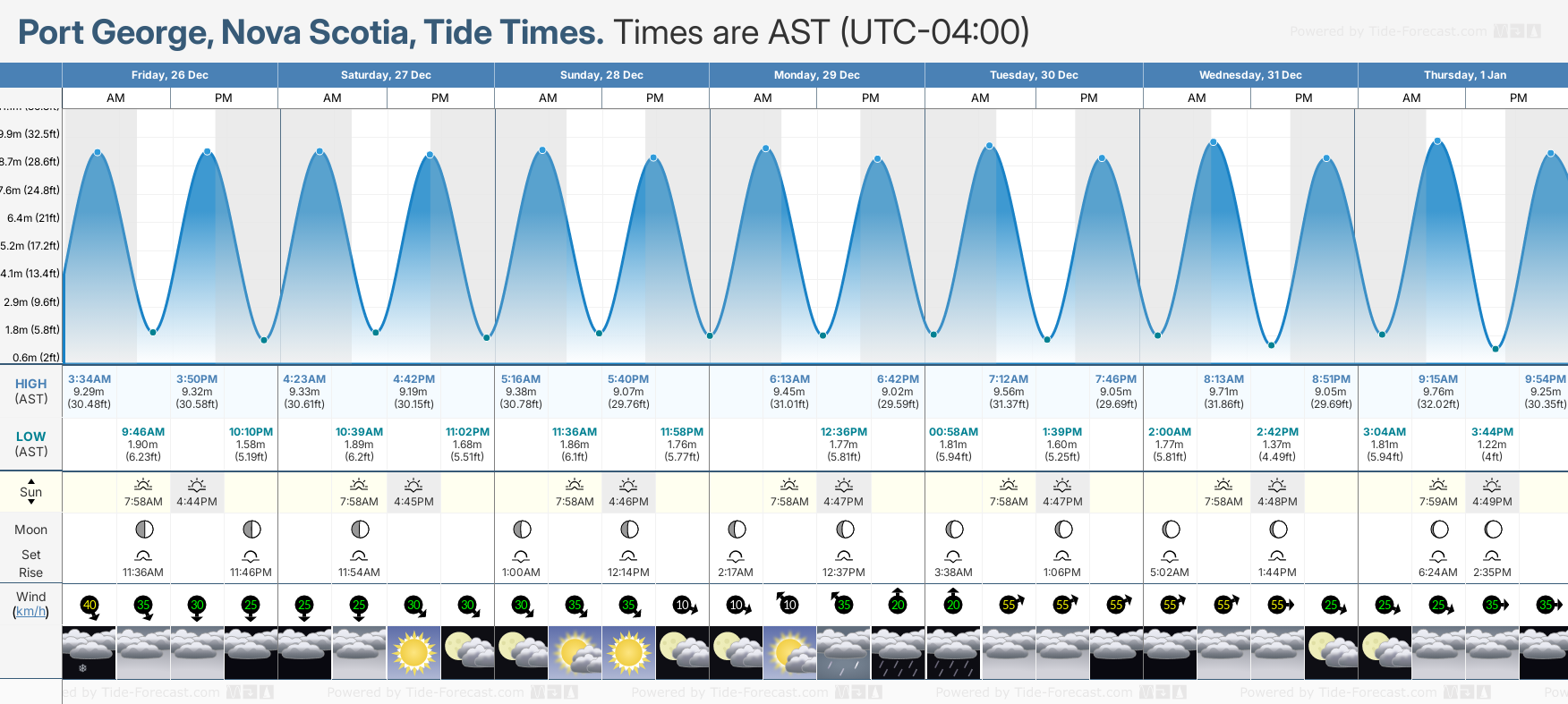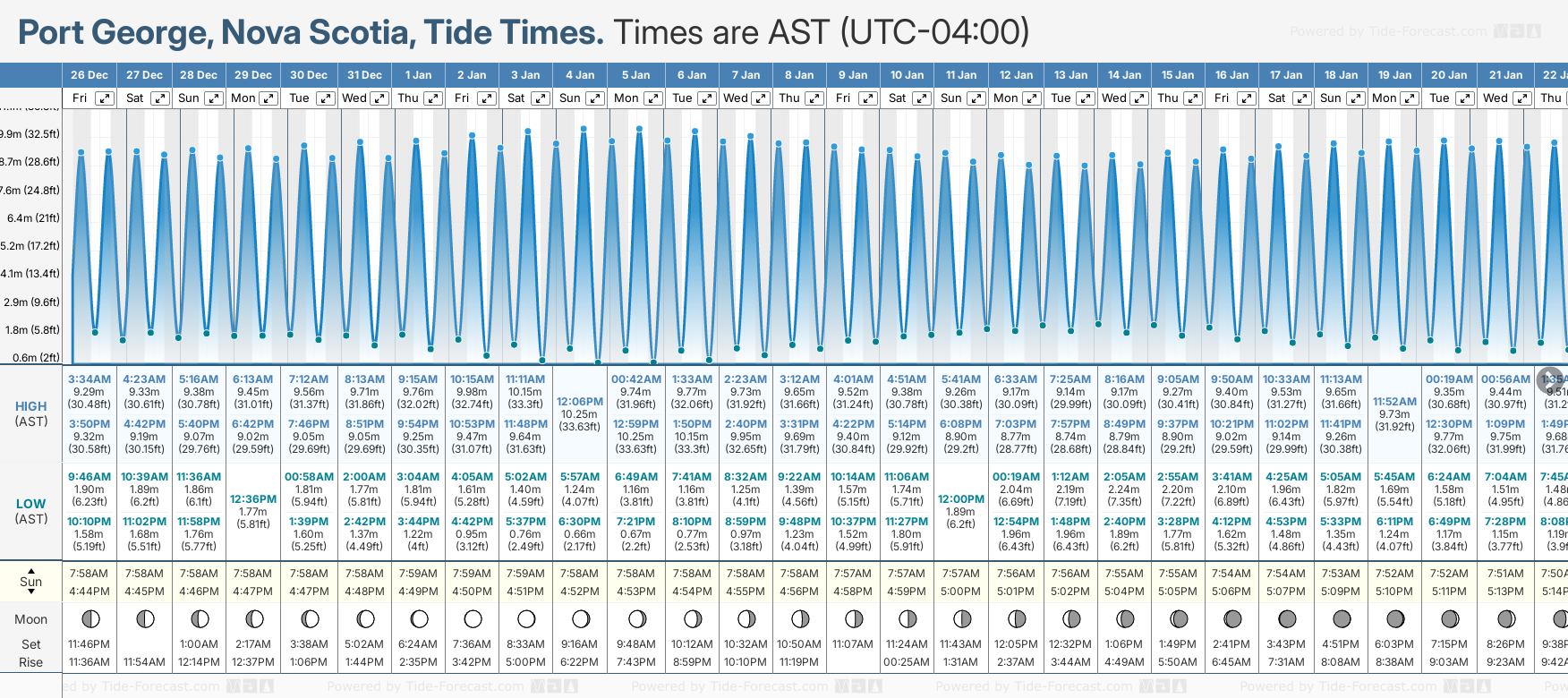 Tide Times are AST (UTC -4.0hrs). Last Spring High Tide at Port George was on Sun 21 Dec (height: 9.64m 31.6ft). Next high Spring Tide at Port George will be on Sun 04 Jan (height: 10.25m 33.6ft).