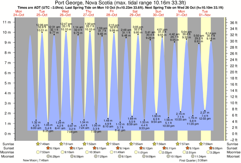 Tide Times are AST (UTC -4.0hrs). Last Spring High Tide at Port George was on Fri 05 Dec (height: 10.40m 34.1ft). Next high Spring Tide at Port George will be on Sun 04 Jan (height: 10.25m 33.6ft).