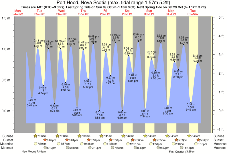 Port Hood tide chart key: The tide chart above shows the height and times of high tide and low tide for Port Hood, Nova Scotia. The grey shading corresponds to nighttime hours between sunset and sunrise at Port Hood.