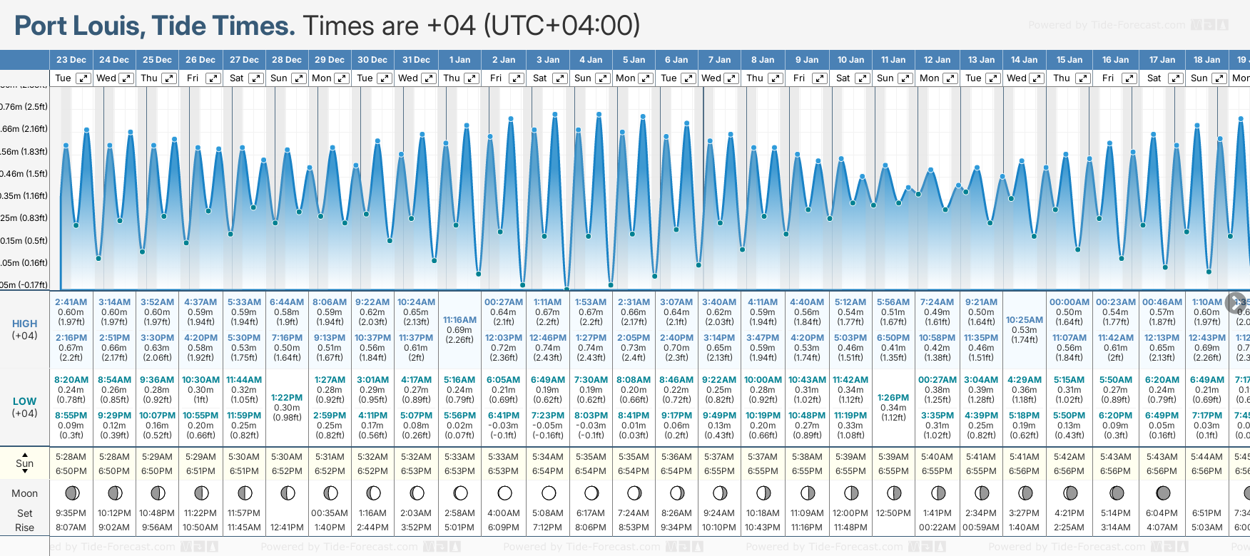 Tide chart for Port LouisShowing low and high tide times for the next 30 days at Port Louis. Tide Times are +04 (UTC +4.0hrs).