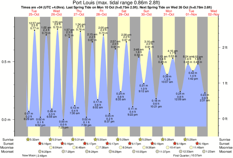 Tide Times are +04 (UTC +4.0hrs). Last Spring High Tide at Port Louis was on Fri 05 Dec (height: 0.76m 2.5ft). Next high Spring Tide at Port Louis will be on Sun 21 Dec (height: 0.68m 2.2ft).