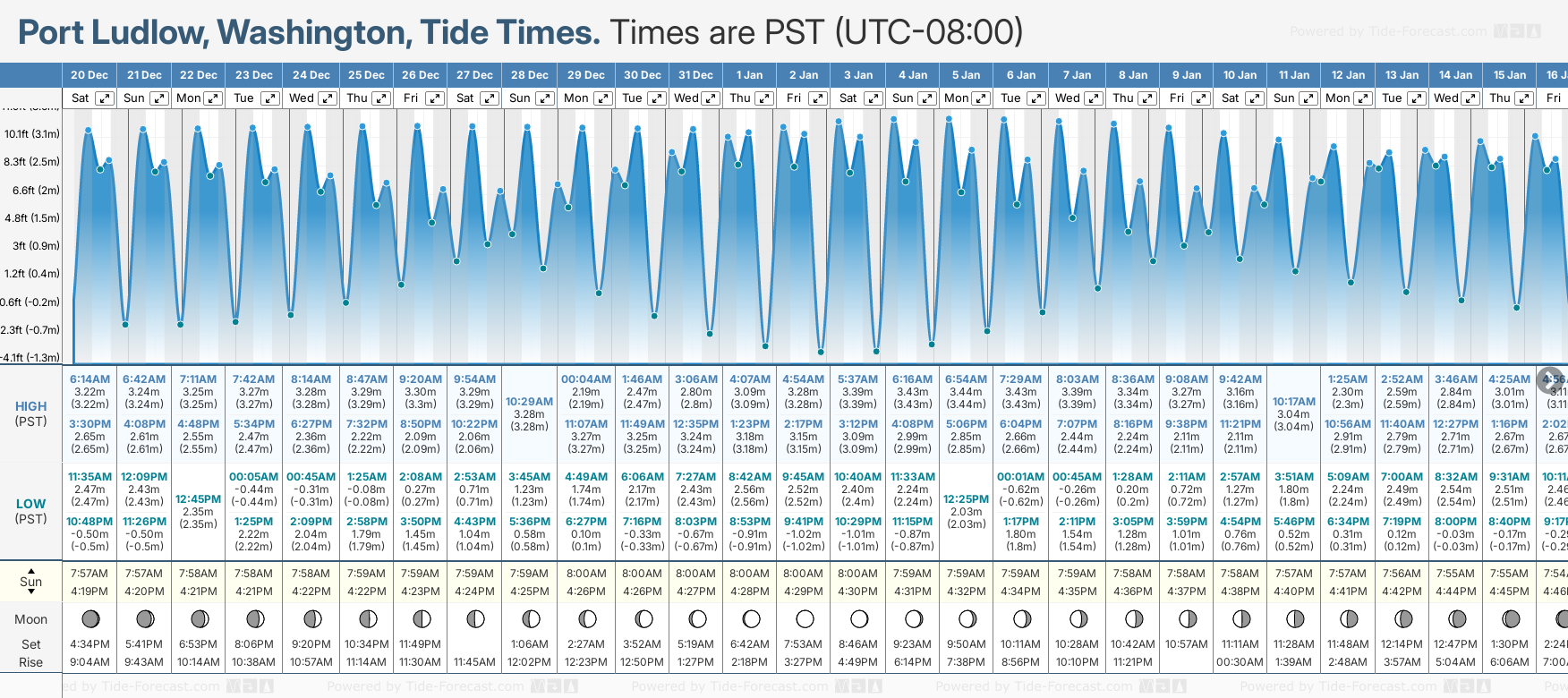 December and January Tide charts for Port Ludlow: The tide charts below show the height, time and date of high and low tides for the next 30 days.