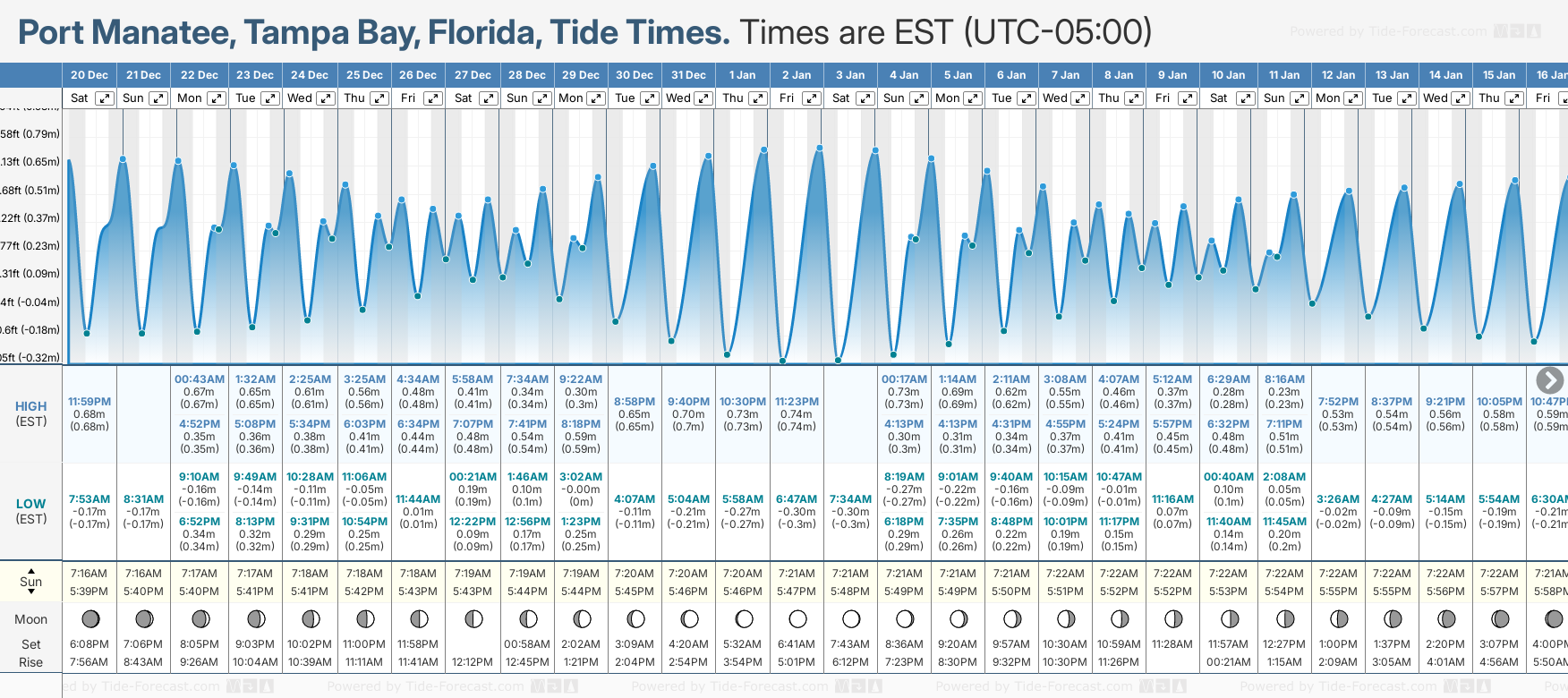 December and January Tide charts for Port Manatee, Tampa Bay: The tide charts below show the height, time and date of high and low tides for the next 30 days.