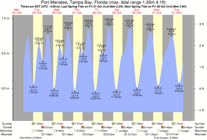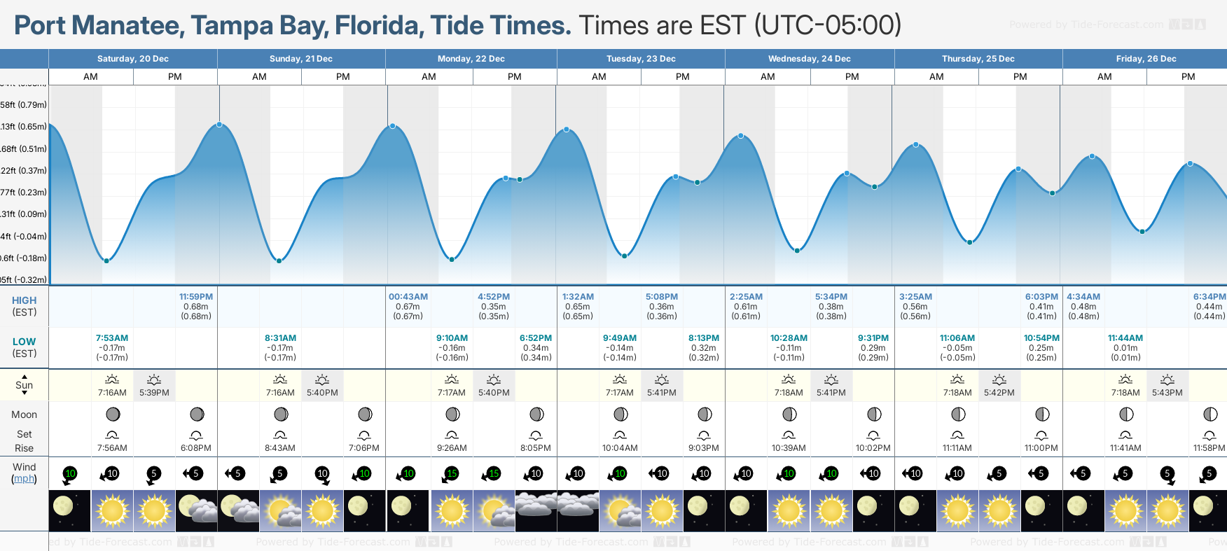 Tide Times are EST (UTC -5.0hrs). Last Spring High Tide at Port Manatee, Tampa Bay was on Fri 05 Dec (height: 0.83m 2.7ft). Next high Spring Tide at Port Manatee, Tampa Bay will be on Sat 20 Dec (height: 0.68m 2.2ft).