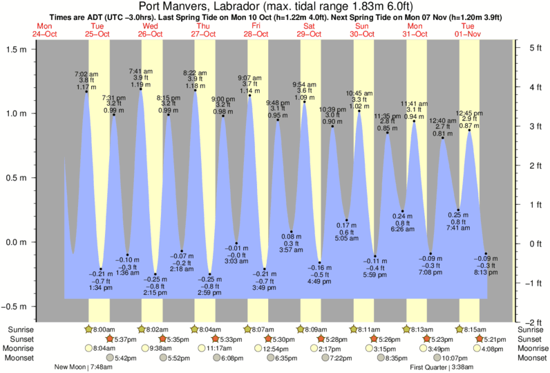 Port Manvers tide chart key: The tide chart above shows the height and times of high tide and low tide for Port Manvers, Labrador. The grey shading corresponds to nighttime hours between sunset and sunrise at Port Manvers.