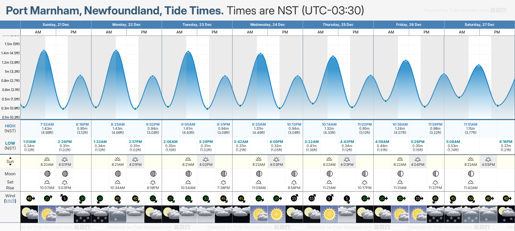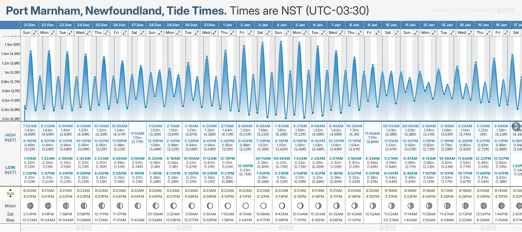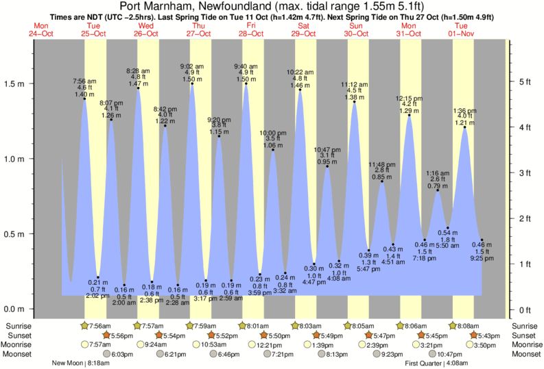 Port Marnham tide chart key: The tide chart above shows the height and times of high tide and low tide for Port Marnham, Newfoundland. The grey shading corresponds to nighttime hours between sunset and sunrise at Port Marnham.
