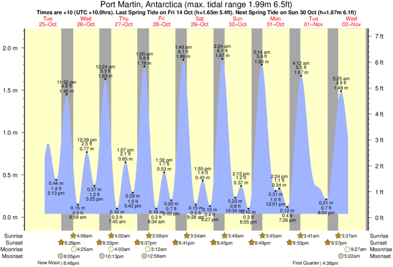 Port Martin tide chart key: The tide chart above shows the height and times of high tide and low tide for Port Martin, Antarctica. The grey shading corresponds to nighttime hours between sunset and sunrise at Port Martin.