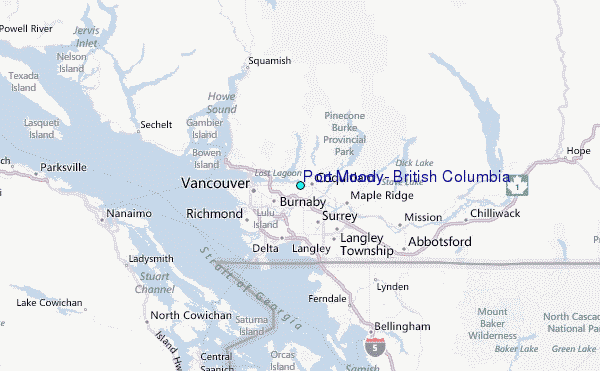 Use this relief map to navigate to tide stations, surf breaks and cities that are in the area of Port Moody, British Columbia.