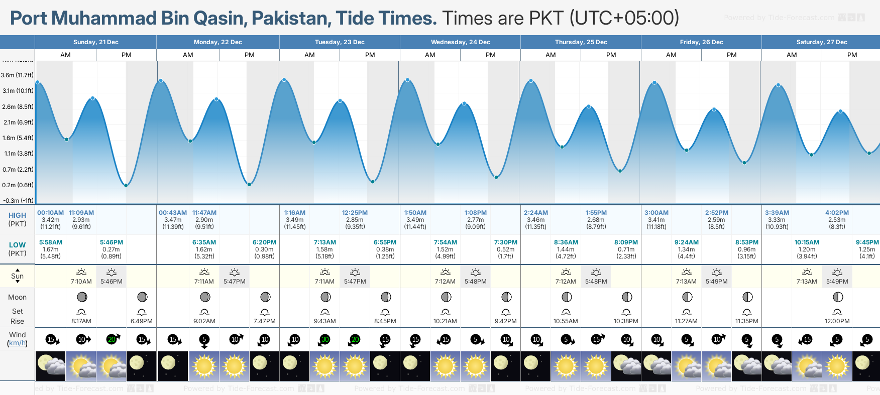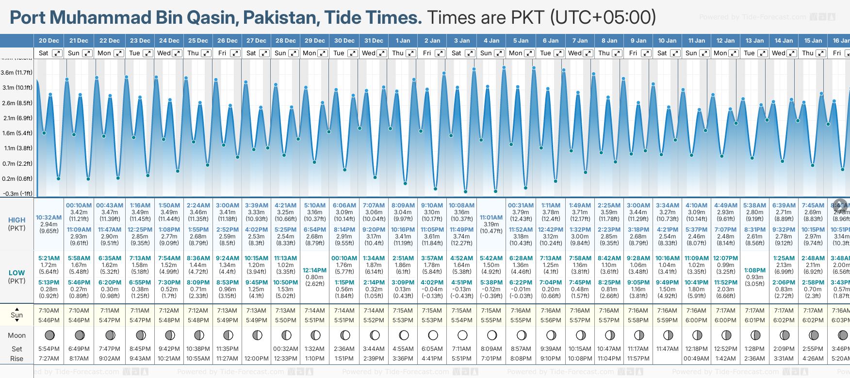 December and January Tide charts for Port Muhammad Bin Qasin: The tide charts below show the height, time and date of high and low tides for the next 30 days.