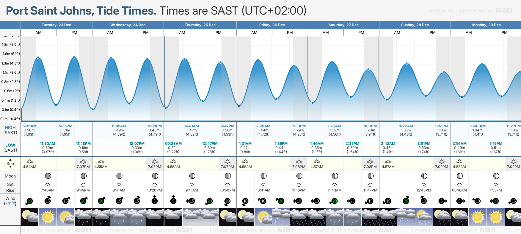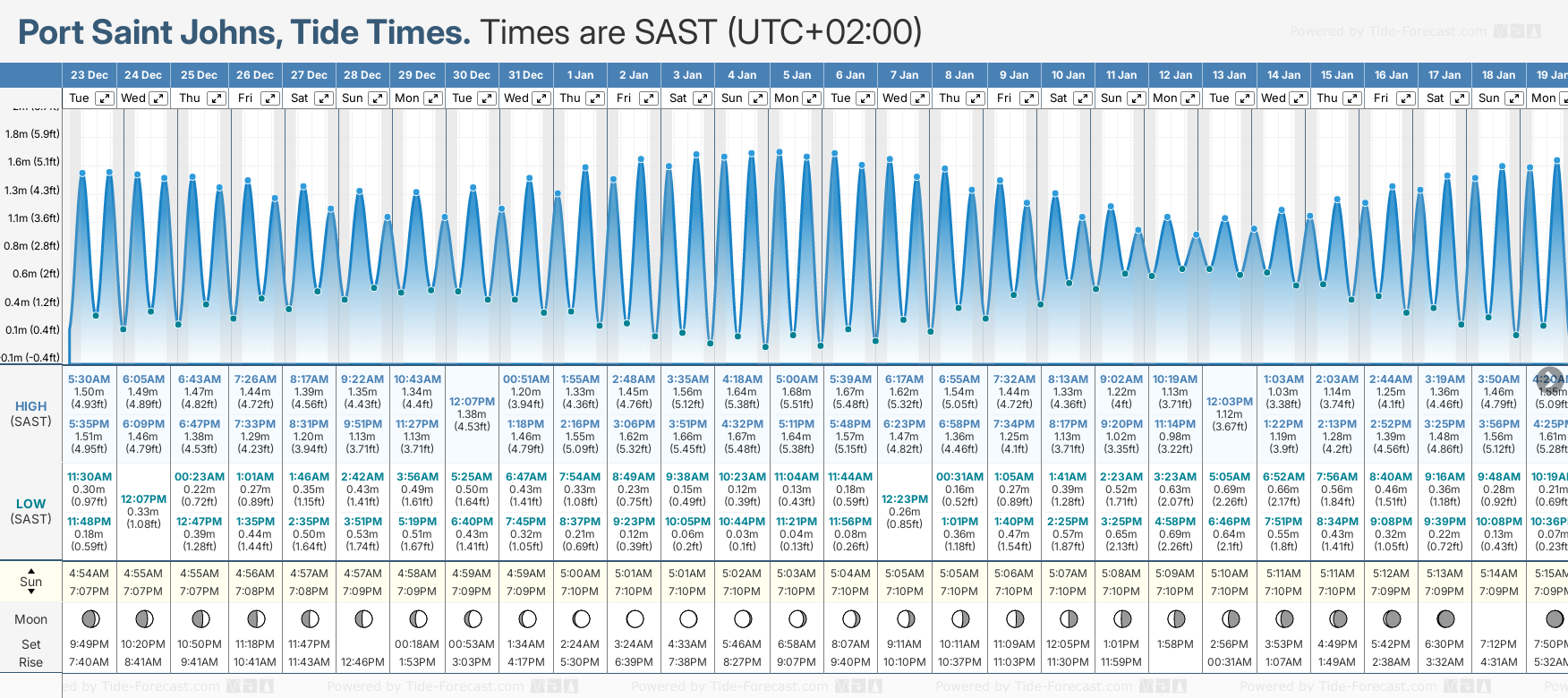 December and January Tide charts for Port Saint Johns: The tide charts below show the height, time and date of high and low tides for the next 30 days.