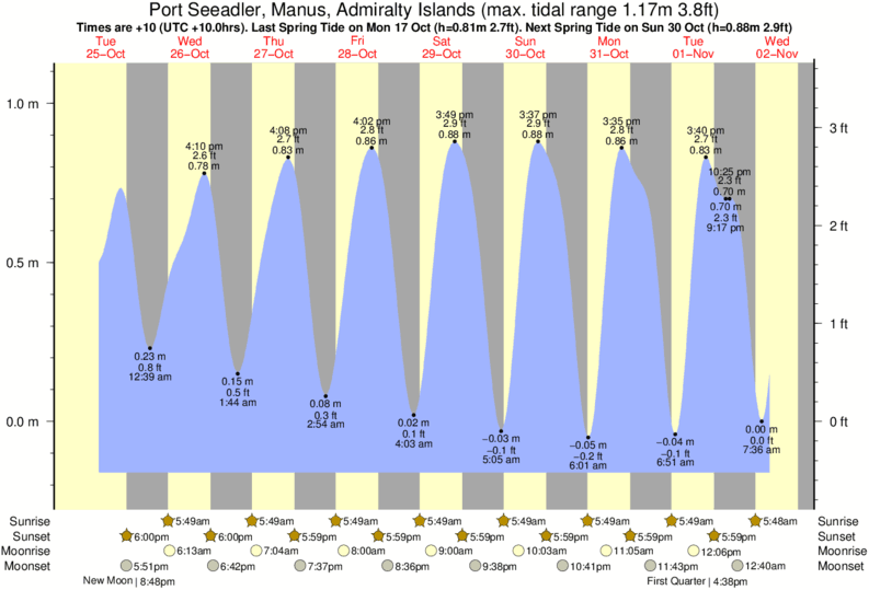 Tide Times are +10 (UTC +10.0hrs). Last Spring High Tide at Port Seeadler, Manus, Admiralty Islands was on Sat 06 Dec (height: 1.01m 3.3ft). Next high Spring Tide at Port Seeadler, Manus, Admiralty Islands will be on Sat 03 Jan (height: 1.02m 3.3ft).
