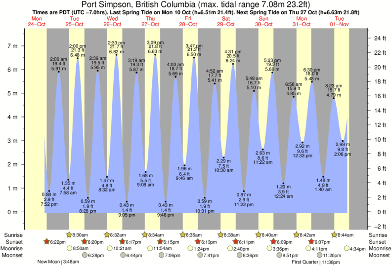 Port Simpson tide chart key: The tide chart above shows the height and times of high tide and low tide for Port Simpson, British Columbia. The grey shading corresponds to nighttime hours between sunset and sunrise at Port Simpson.