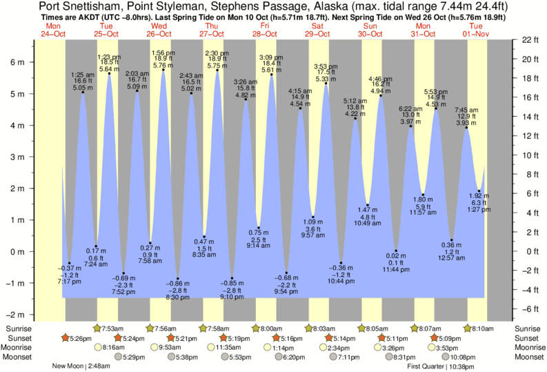 Tide Times are AKST (UTC -9.0hrs). Last Spring High Tide at Port Snettisham, Point Styleman, Stephens Passage was on Fri 05 Dec (height: 6.07m 19.9ft). Next high Spring Tide at Port Snettisham, Point Styleman, Stephens Passage will be on Sun 21 Dec (height: 5.11m 16.8ft).