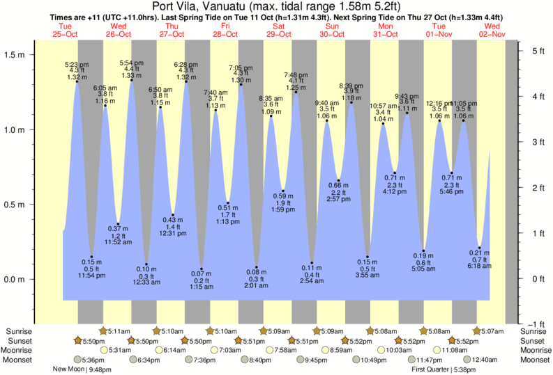 Tide Times are +11 (UTC +11.0hrs). Last Spring High Tide at Port Vila was on Sat 06 Dec (height: 1.45m 4.8ft). Next high Spring Tide at Port Vila will be on Sun 04 Jan (height: 1.43m 4.7ft).