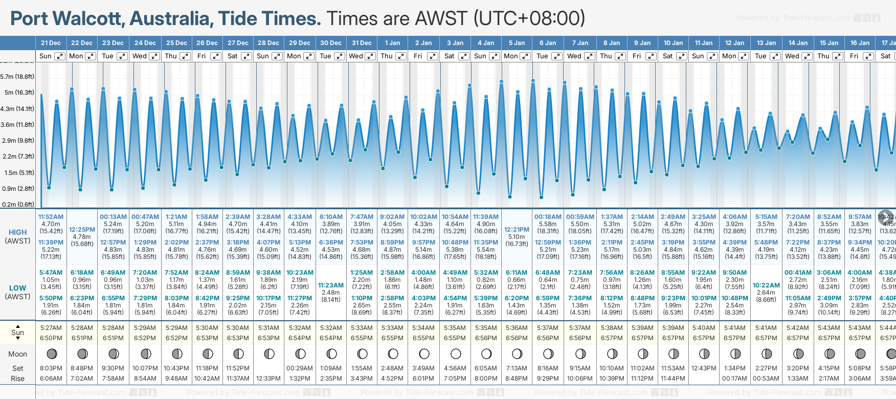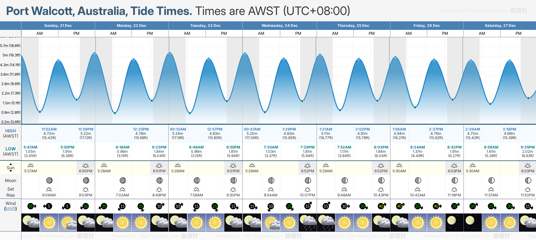 Tide Times are AWST (UTC +8.0hrs). Last Spring High Tide at Port Walcott was on Sun 07 Dec (height: 5.71m 18.7ft). Next high Spring Tide at Port Walcott will be on Tue 23 Dec (height: 5.24m 17.2ft).
