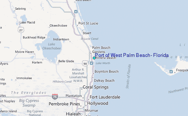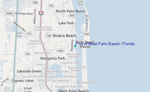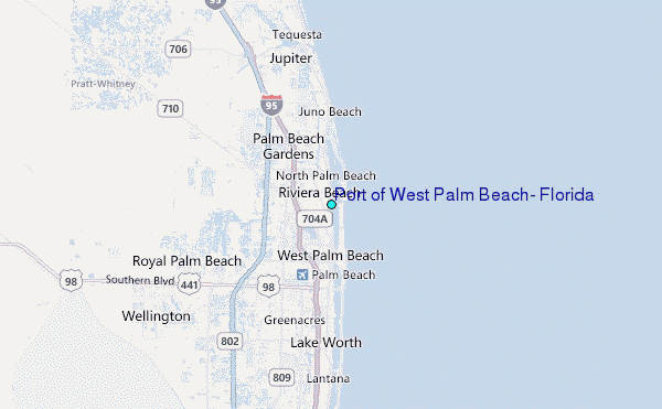 Use this relief map to navigate to tide stations, surf breaks and cities that are in the area of Port of West Palm Beach, Florida.
